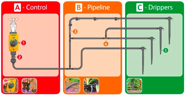 Included in the kit is Hozelock’s best selling Select Controller Timer. Simple and easy to use with 16 pre-set programs to supply water from once a week up to four times a day.