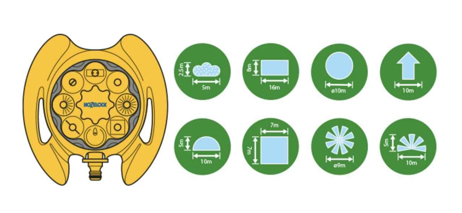 Perfect for all surfaces – Mounted on sled base to suit all surfaces. Even coverage – Specially designed to give 100% even water coverage regardless of the water pressure (1-10 bar). Easily Adjustable – Complete with soft-touch easy-grip adjuster ring for changing spray patterns even with wet hands. Suits all watering shapes & types – There are 8 spray patterns – small semi circle, large semi circle, mist, strip, large circle, small circle, square and remote jet.