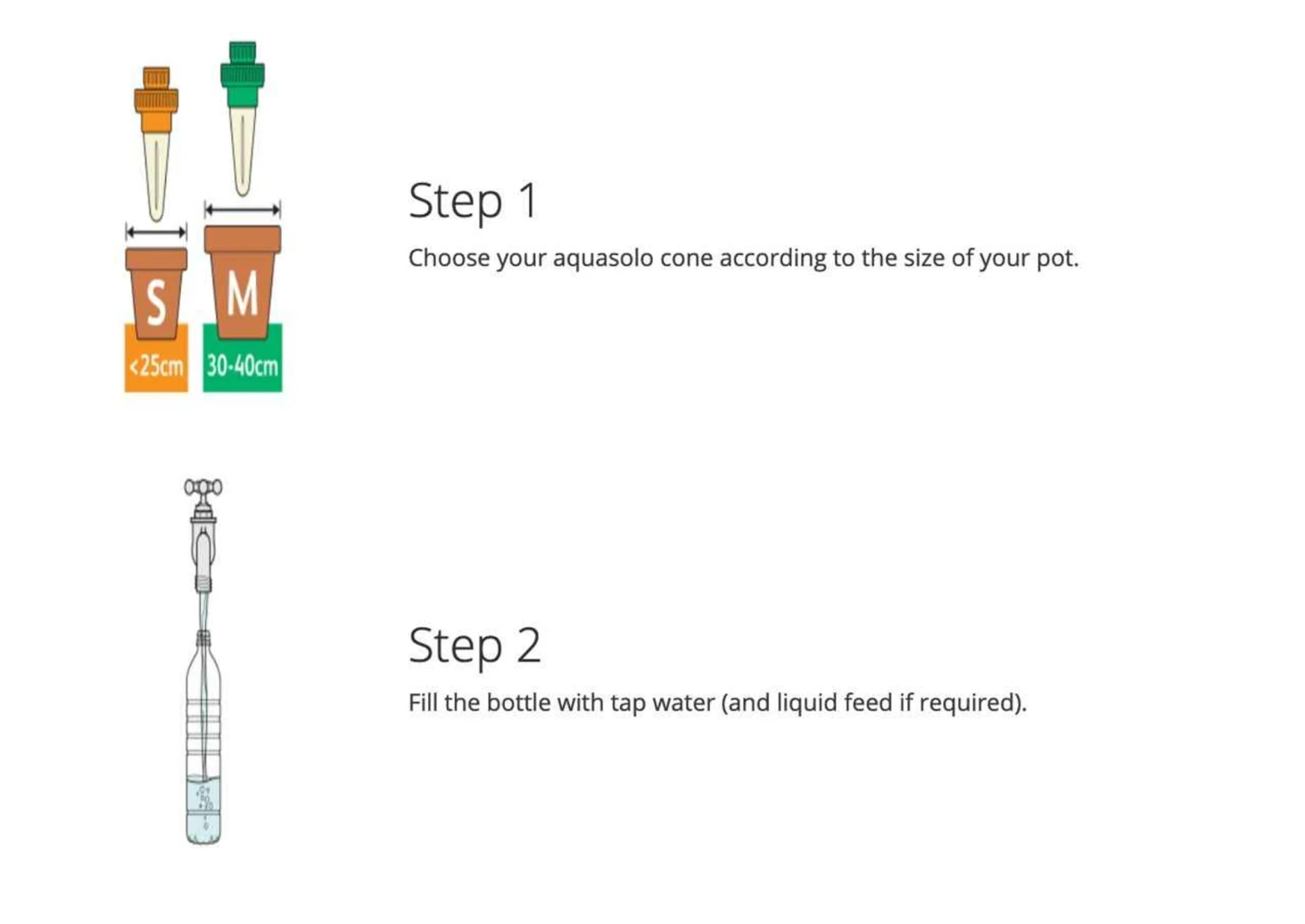 This simple automatic watering system consists of a patented ceramic cone and a plastic screw adapter that fits on almost every 0.5 to 5 liter plastic bottle and is set up in just a few minutes. Thanks to the reusable reservoir, the Aquasolo can also be used to provide liquid plant food. It is a handy system for both greenhouse plants and house plants.