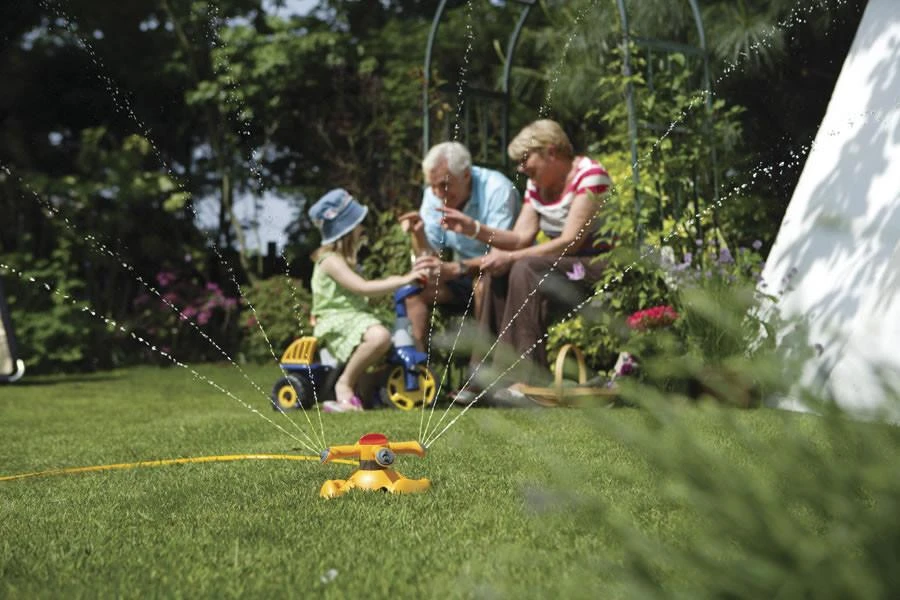 The Hozelock Round Sprinkler Plus is a four arm rotating lawn sprinkler which operates as either a jet spray for watering lawns and borders, or a misting spray for watering seedlings and delicate plants. With a maximum water coverage of 254 metres² (a max diameter of 18 metres), this Hozelock lawn sprinkler is great value for money. Mounted on a sled base for stability and easy movement.