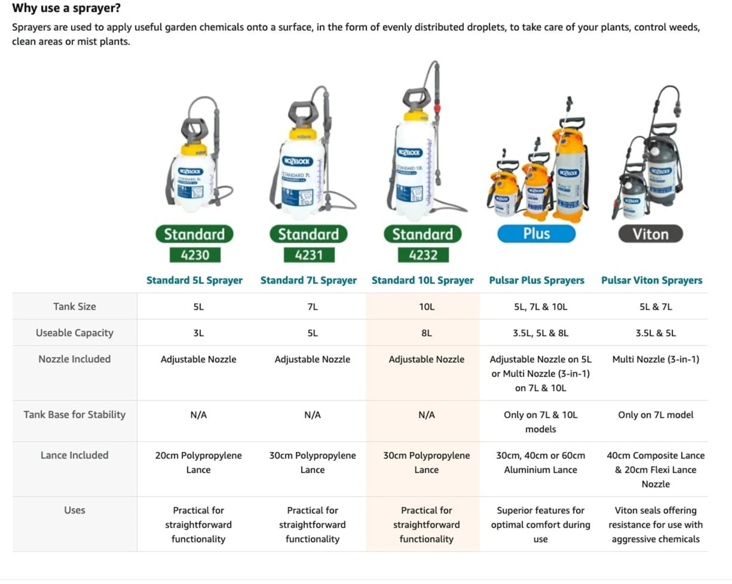 The Hozelock Standard Pressure Sprayer is a high quality, convenient multi-purpose sprayer, effective for outdoor use. Easy, Accurate & Cost Effective Application – For use with water-based solutions of insecticides, fungicides, weedkillers and fertilisers. Wide Ergonomic Handle – Makes pressurising the sprayer easy whilst the translucent, graduated bottle aids accurate chemical mixing and dosing. Available in three sizes – 7 Litres (useable capacity is 7 Litres*), Please note, the useable capacity of these sprayers is less than the overall capacity due to needing to provide sufficient air gap for pressurisation of the bottle.