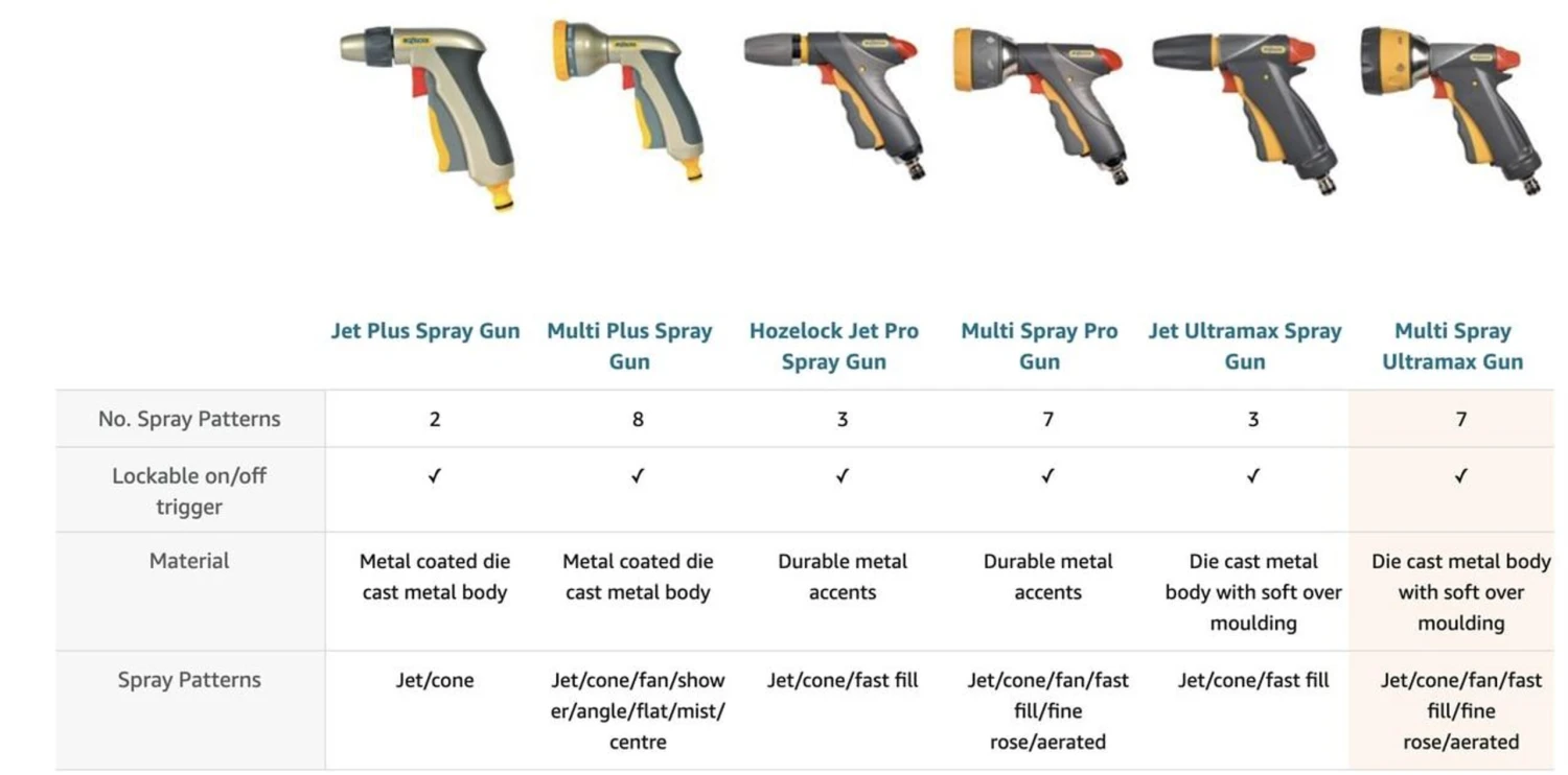 Features Die cast metal body for ultimate strength and durability Lockable on/off trigger with separate flow control Seven spray patterns